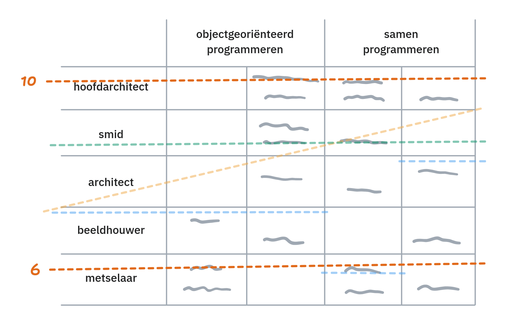 Je begint in deze module als metselaar, waarbij je de basis leert van objectgeoriënteerd programmeren en kunt samenwerken met anderen zonder hen in de weg te lopen. Dat hoeft niet vanaf het begin perfect te gaan, maar dat is wel wat we verwachten dat je aan het einde echt onder de knie hebt. Als je je verder wilt ontwikkelen en meer wilt bijdragen aan het spel, dan kun je verder opklimmen en grotere taken in het spel op je nemen als beeldhouwer, architect, smid of zelfs als hoofdarchitect. Wil je meer doen, maar weet je hoe? Vraag je docent om hulp!