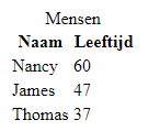 Dit geeft het resultaat aan de rechterkant. Er kunnen nog meer dingen worden aangepast aan de tabel. Kijk hiervoor op https://www.w3schools.com/html/html_tables.asp als je geïnteresseerd bent. De tabel ziet er nu ook nog redelijk saai uit. Dit gaan we echter later met CSS verbeteren.